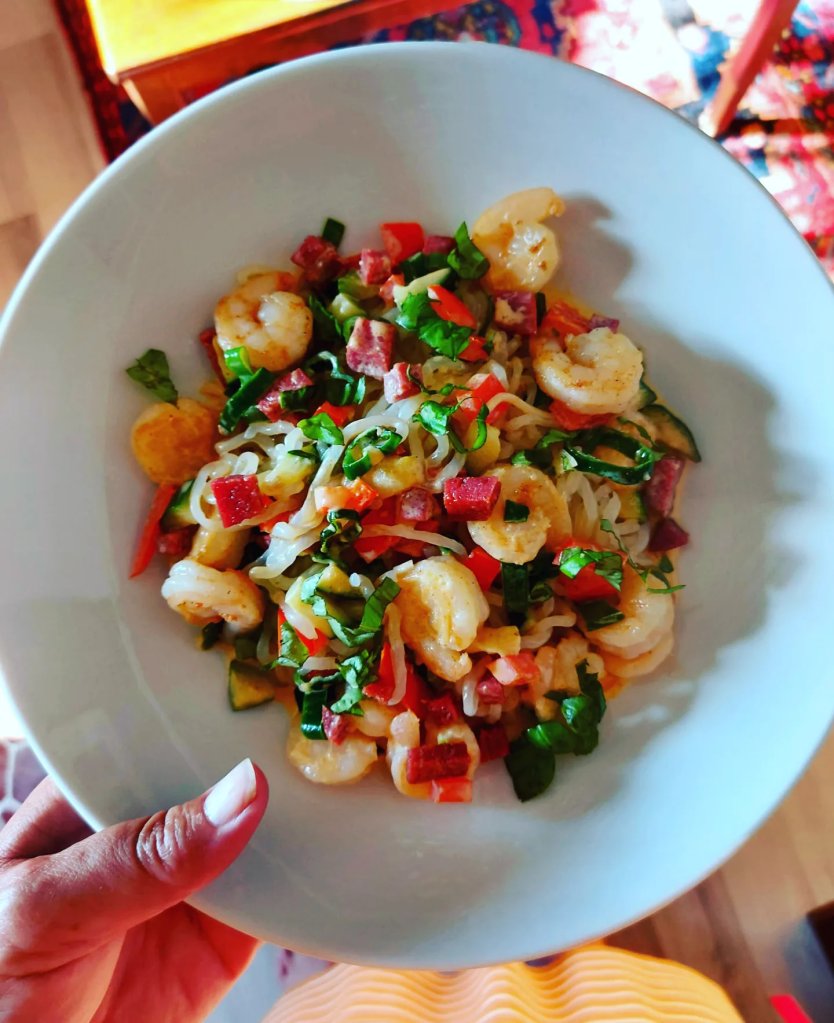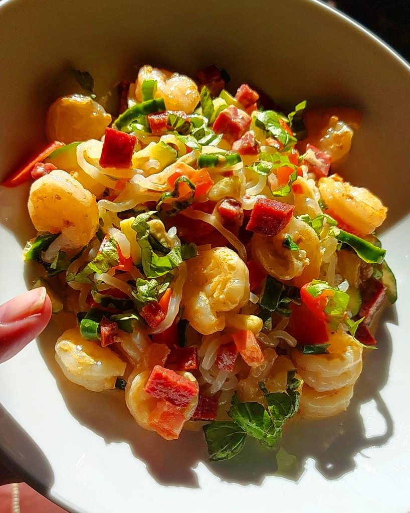 Jeg måtte bare prøve å gjenskape en av mine favoritter fra min tid som kokk på kulten. Altså pasta med sjømat er nok min favoritt hvis jeg først skal spise pasta, enten det er med skalldyr eller fisk. Denne komboen får jeg vann i munnen av bare av å tenke på. Lavkarbo varianten ble selvfølgelig litt anderledes i smak og konsistens, men den smakte helt fortreffelig.