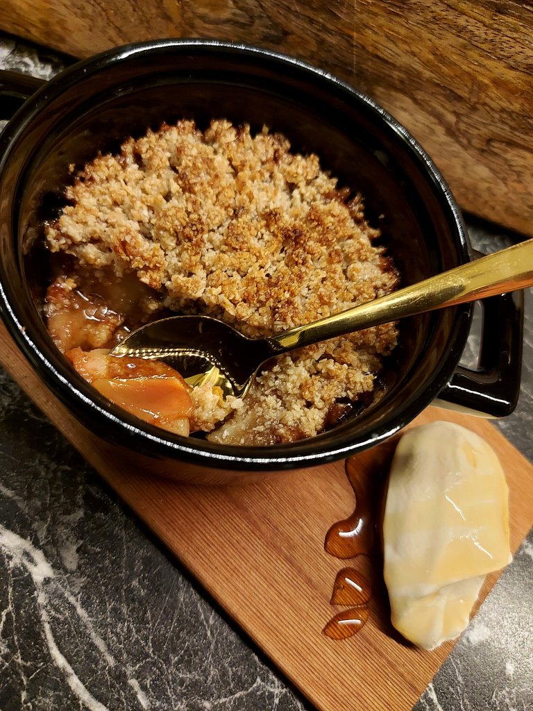 For å toppe det hele serveres apple crumbel sammen med Crème Fraîche med litt sukrinsirup over.
