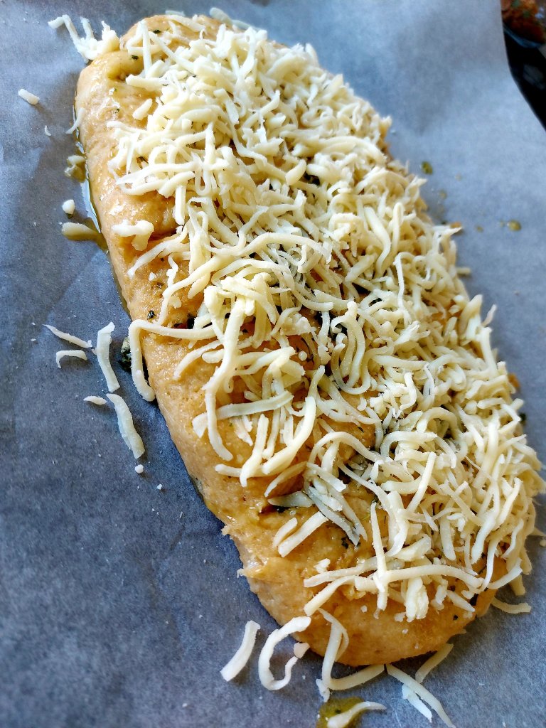 Pensle brødet med smeltet smør tilsatt hvitløk og persille. Pass på å pensle godt i mellom snittet på brødet og topp med mozzarella. Ha gjerne litt ekstra ost i snittet på brødet, da blir det ekstra digg! Spar gjerne litt av smøret til etterpensling.