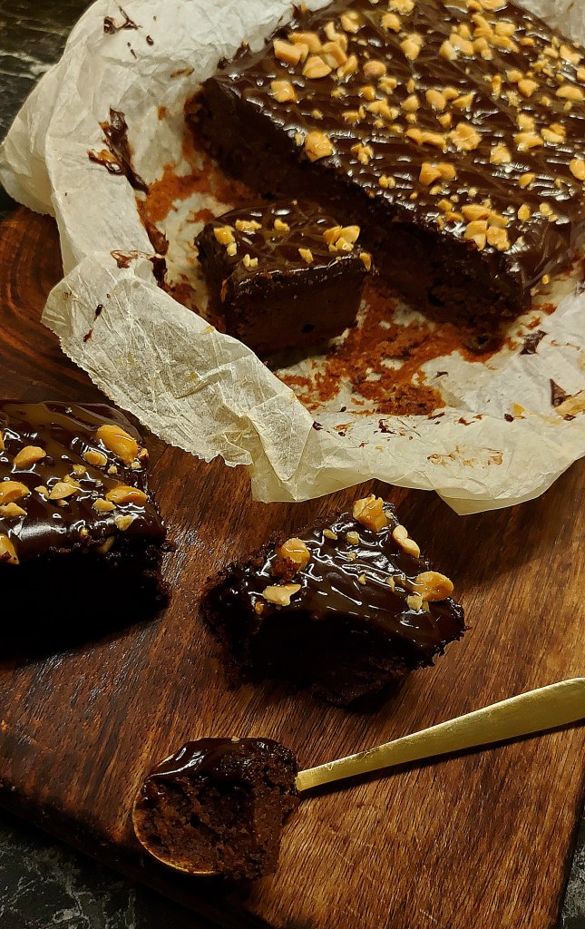 Avkjøl kaken i ca 10 min før du prikker forsiktig i den med en gaffel. Hell over lakrisganache og brer den jevnt utover. Strø over hakkede peanøtter og topp med salt karamell.