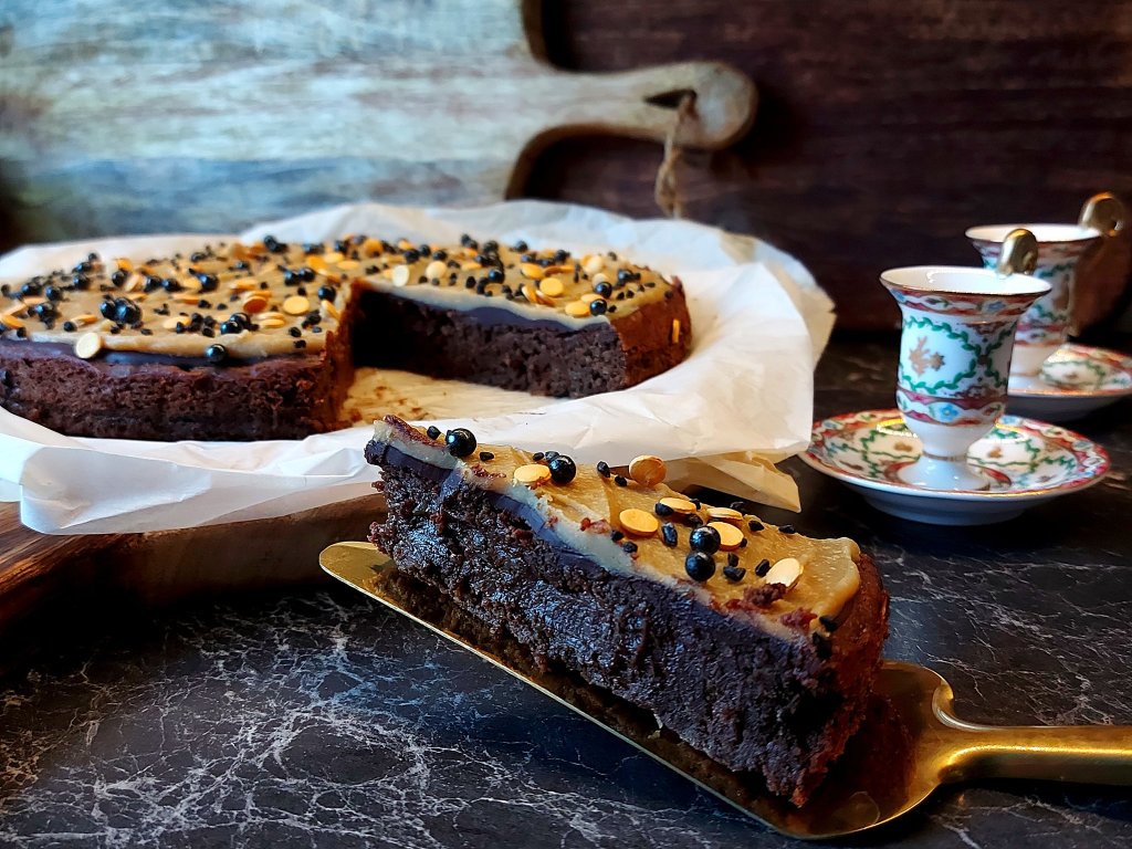 Avkjøl kaken i ca 10 min før du prikker forsiktig i den med en gaffel. Hell over lakrisganache og brer den jevnt utover. La kaken avkjøles til romtemperatur før du setter den på kjøl. La kaken stå kjølig frem til ganachen er helt stiv.