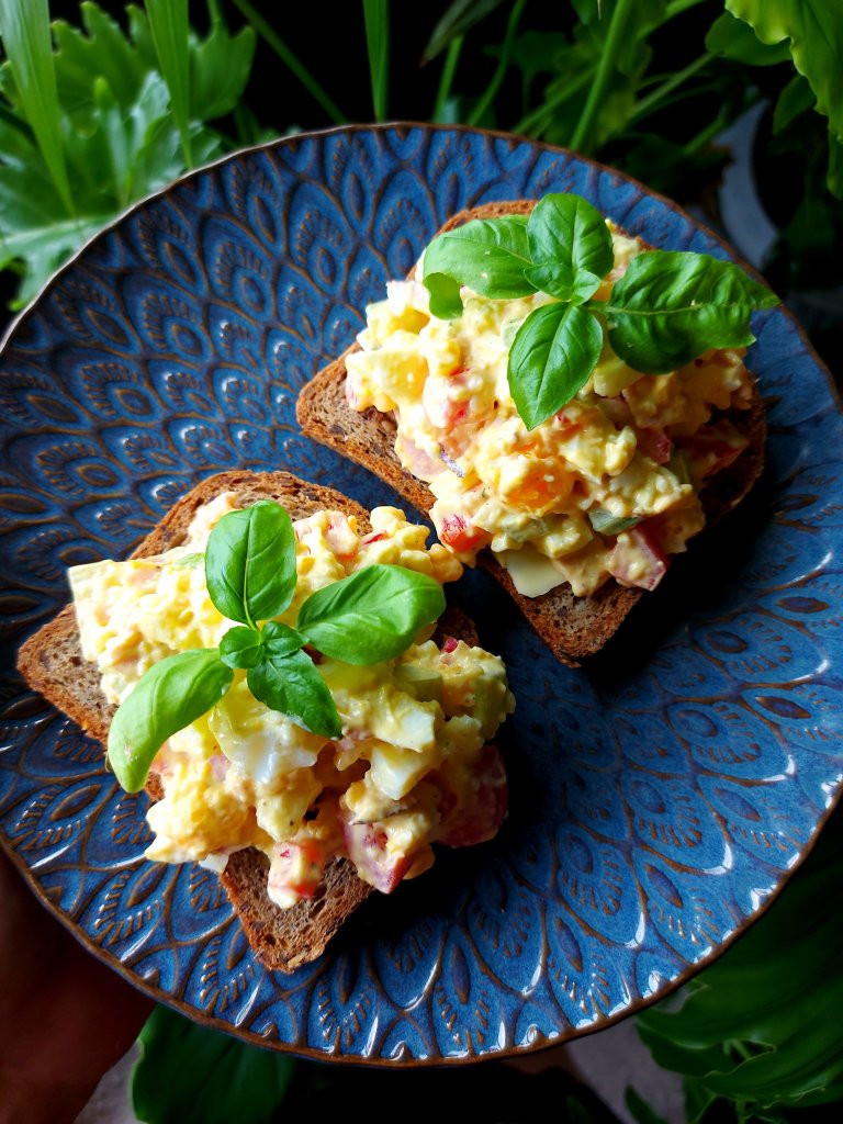 Bland sammen majones og smak deg frem med krydder. Kutt grønnsaker og egg i terninger og vend det inn i majonesen.