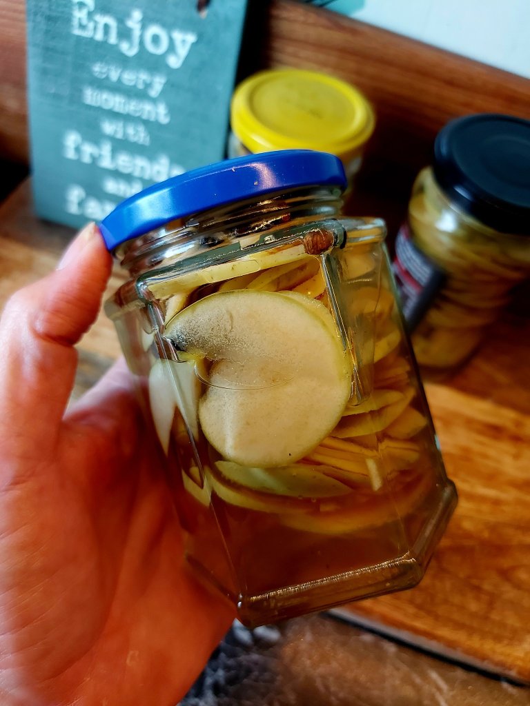 Fordel epleskiver i sterile glass og hell over laken. Stikk en liten kanelstang i siden på hvert glass og avslutt med stjerneanis. Skru på lokk og snu glasset på hode til glasset er avkjølt for å danne vakum. Oppbevar glassene mørkt og kjølig.