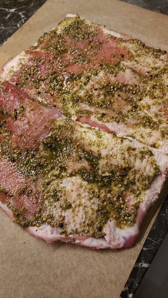 Gni kjøttet inn med halvparten av krydderblandingen. Legg «klaffene» tilbake på plass og gni resten av krydderet godt inn i kjøttet. Fjern eventuelt noe av svoren hvis det ligger an til at noe svor havner inn i rullen, dette vil variere litt i forhold til størrelse og fasong på ribba.