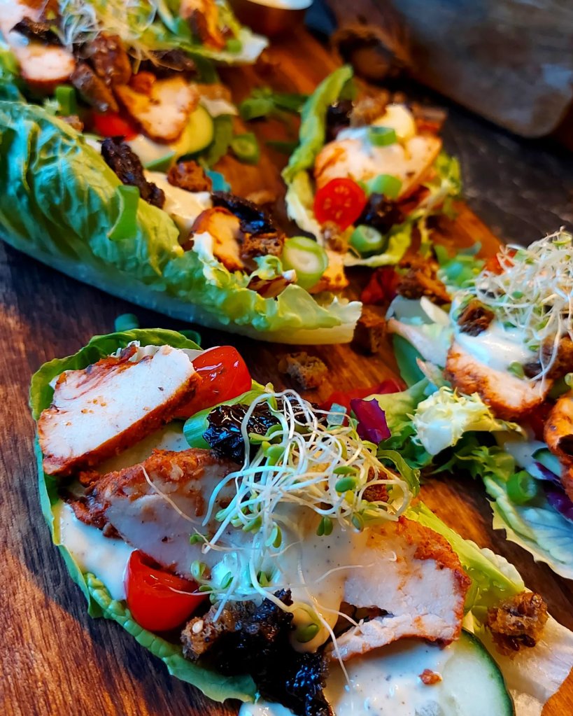 Bre hjertesalat utover en fjøl eller fat og fyll de opp som anvist på bilde. Ha over ønsket mengde dressing, strø over litt revet parmesan og topp med knasende gode urtekrutonger og alfaspirer til slutt.