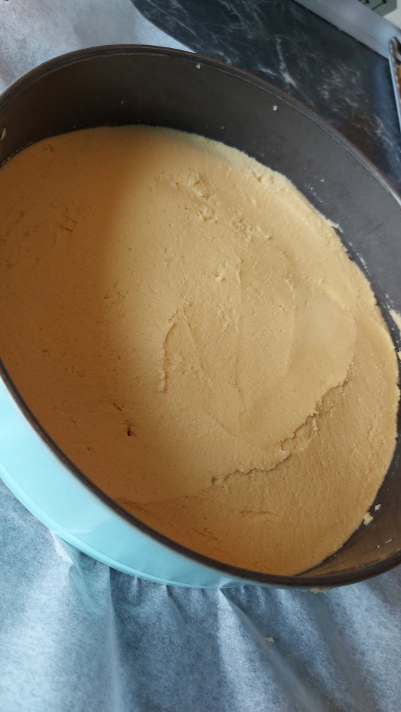 Hell røren i en smurt mellomstor springform med bakepapir i bunn, og bre røren jevnt utover helt ut i kanten på formen. Røren har en ganske tykk konsistens, så her må man jobbe litt for å få jevnt resultat.